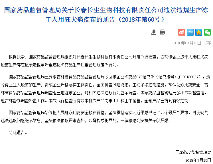 7月15日,國家藥品監督管理局通告:近日,國家藥監局根據線索組織檢查組對長春長生生物科技有限責任公司(以下簡稱“長春長生”)生產現場進行飛行檢查。檢查組發現,長春長生在凍干人用狂犬病疫苗生產過程中存在記錄造假等嚴重違反《藥品生產質量管理規范》(藥品GMP)行為。