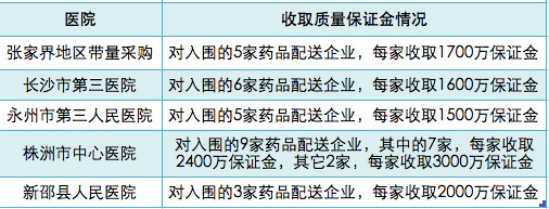 而據(jù)湖南省藥品流通行業(yè)協(xié)會(huì)透露,近些年來,湖南省一些公立醫(yī)療機(jī)構(gòu)在遴選藥品配送企業(yè)時(shí),收取數(shù)額巨大的的質(zhì)量保證金,是非常普遍的現(xiàn)象。從地區(qū)帶量采購,到三甲醫(yī)院,甚至縣級醫(yī)院,都是如此。(部分情況見下表)
