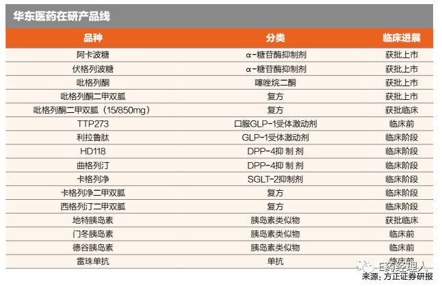 例如在糖尿病領(lǐng)域。一直以來,糖尿病藥物領(lǐng)域就是華東醫(yī)藥的核心產(chǎn)品線,代表品種是阿卡波糖,目前其銷售規(guī)模上億元的七個(gè)大品種中,卡博平(阿卡波糖片)已經(jīng)是兩個(gè)20億元級(jí)別重磅產(chǎn)品之一。因此華東醫(yī)藥在糖尿病領(lǐng)域的研發(fā)布局,基本上呈現(xiàn)出的就是以傳統(tǒng)用藥阿卡波糖片為重心,逐漸向各類新型制劑升級(jí)的趨勢,包括在GLP-1類、DPP-4類、SGLT-2類以及三代胰島素等重點(diǎn)產(chǎn)品方面的布局,從而逐漸形成糖尿病臨床主流用藥全覆蓋。