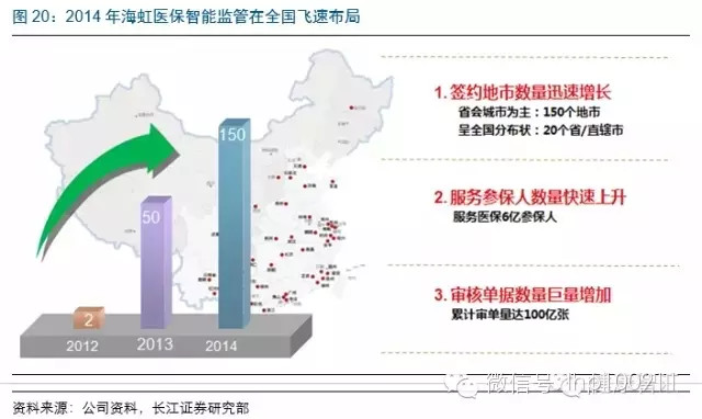 “湛江模式”在醫?;鸸芾砟J降耐黄?,是海虹大健康生態圈進程中的重要里程碑,其內涵包括:1、智能審核控費和支付評審,湛江社?;饘⒁院:绲脑露葘徍私Y算數據為參考指標,進行費用的核定和撥付,并與醫院進行核查、分析、評審;2、醫保大數據分析,提供基金科學管理的決策支持;3、建立醫保支付價格庫和評價體系,基于1999年開始在藥品、耗材招標采購價格知識庫的積累,建立藥企、醫院、醫保之間的定價機制和醫療服務質量的評價體系;4、藥品器械集中采購(GPO),掌握了代表醫保向上游藥企議價的權利,極大利好公司醫藥電商業務的開展;5、建立個人健康檔案,參保人可實現基于移動APP進行歷史健康數據的查詢,并為其提供綜合性醫療健康落地服務等。