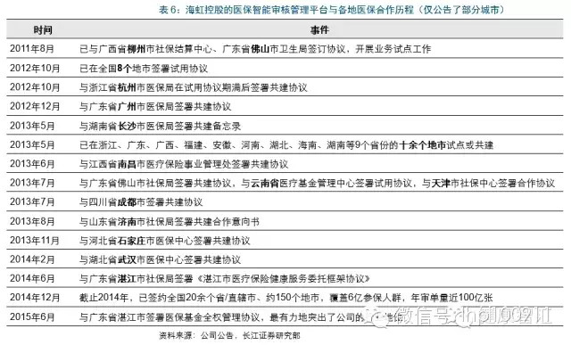 PBM系統的控費審核僅僅是海虹控股的叩金石,由控費向掌握數據資源、醫療落地服務資源,進而向綜合醫療服務延伸才是其核心宗旨。2015年6月11日,海虹控股公告與湛江簽署《湛江市基本醫療保險支付審核服務委托協議》,全權委托海虹作為專業服務機構進行湛江市醫保基金審核、支付、評價以及參保人服務等,標志著海虹PBM業務從“控費”升級為“醫保基金全權管理”,是屬國內首創,體現出公司強大的頂層資源整合能力,有望在其他核心合作城市大范圍異地復制,具有劃時代意義!