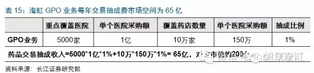 GPO業務有望按照藥品交易量抽成,收入空間約65億,對應市值空間約200億:海虹自2000年開展醫藥電子商務業務,巔峰時期接入了12000家醫療機構,藥品成交額突破1600億,市占率達70%。當前我國藥品市場年交易量約1.3萬億,在GPO試點不斷推廣的趨勢下,海虹有望重演醫藥電商的輝煌。而考慮到當前醫藥電商市場競爭加劇,我們僅以海虹計劃深度覆蓋的5000家主流醫院、10萬家藥店為基數(全國約40萬家藥店),年交易量有望突破6500億。我們假設按照1%的比例收取平臺服務費,公司的GPO業務每年收入空間約65億,按照電商平臺平均3倍PS水平,對應市值約200億。