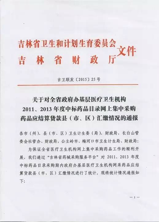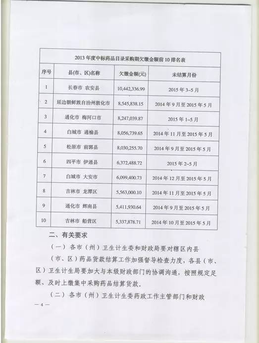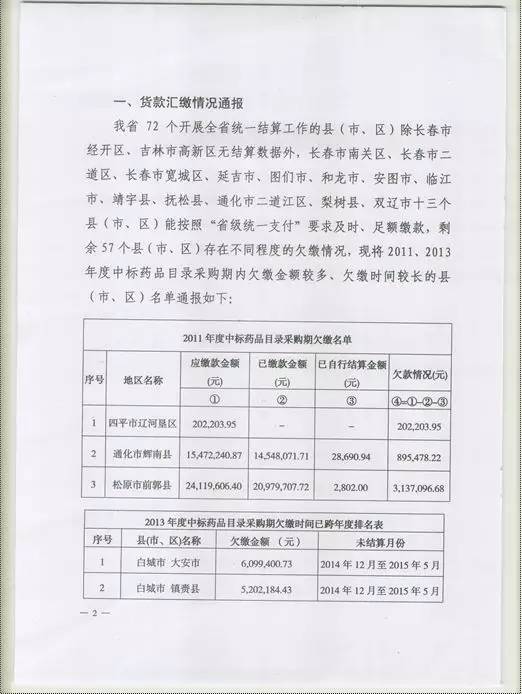 以下是吉林省衛計委近期發出的文件,針對全省政府辦基層醫療衛生機構2011、2013年度中標藥品目錄網上集中采購藥品應結算貨款縣(市、區)匯繳情況的通報。從通報的內容上看,基層醫療機構財政結算執行不容樂觀,全省72個縣,有57個縣不能按時足額結算,所拖欠貨款居然從2011年至今長達4年之久,這就不難理解一些地區長達半年甚至超過一年的回款賬期。吉林是中國的一個縮影。
