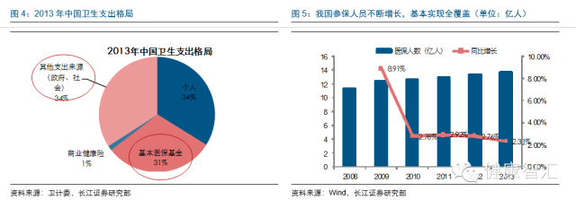 第一、全民醫保的制度體系,決定了醫保基金承擔了主要支付重任。我國從1998年開始城鎮職工基本醫保制度,目前已形成以城鎮職工醫保、城鎮居民醫保、新農合、城鄉居民大病保險為主的基本醫保體系,2013年參保人數已達13.72億,基本實現全民覆蓋,決定了政府醫保基金是我國醫療支付的主體。