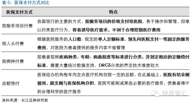 我國醫保控費的主要形式分為四種,按服務項目收費、按病種付費、按人頭付費、總額預付。其中,按服務項目收費容易誘導過度醫療,按人頭付費和總額預付均屬于預付制,容易引發必要的醫療服務不足。我們認為,按病種付費將患者按病種、病患程度、年齡等精細化分類,最有望成為未來的主流模式。