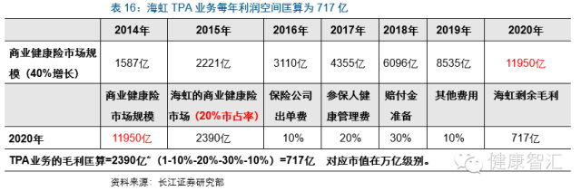 TPA業務顛覆傳統核保核賠獲得分成的模式,而是在慢病險種領域占據主場地位,至2020年毛利空間達百億級別,對應市值在萬億級別:我們認為,政府鼓勵商業健康險發展的核心動力是增加商保的支付比例,若僅按現有模式針對健康人群發布產品,永遠無法達到為醫保分憂的目標。因此,海虹針對慢病人群的商業健康險具有巨大的政策支持力度和市場空間。未來5年商業健康險市場規模達到萬億已是市場共識,假設我國商業健康險未來以年均40%增長,我們預計海虹控股有能力占據20%的市場份額,2020年海虹有望占據2390億保費收入。再假設保險公司分得10%的出單通道費、對參保人的管理費用約20%,并扣除30%的賠付金準備、10%的人工和系統等其他費用,則海虹剩余毛利為717億元,對應市值則在萬億級別。